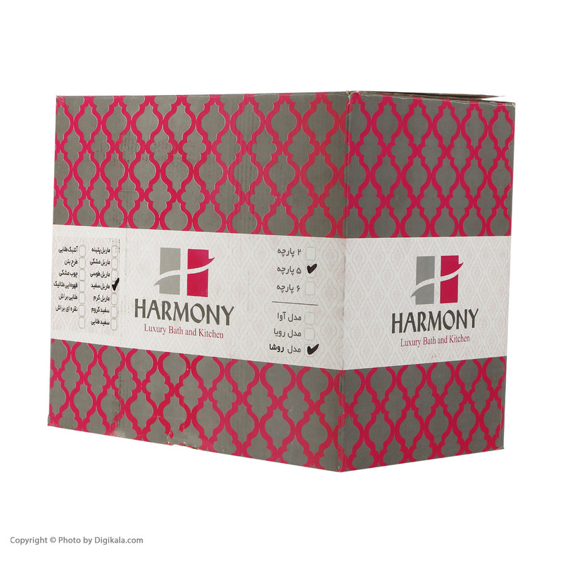 ست 5 پارچه هارمونی مدل روشا جدیدترین محصول شرکت هارمونی می باشد . گزینه ی کروم را انتخاب کنید).جنس این محصول از پلاستیک بسیار با کیفیت (ABS) و جدیدترین تکنولوژی آبکاری (آبکاری تحت خلا PVD) که کاملا مناسب محیط های مرطوب مثل سرویس بهداشتی و حمام می باشد.درب این محصول برای سهولت استفاده هم به صورت پدالی هم به صورت باد بزنی می باشد .برس این کار یک تکه با سری زبر و مقاومت بالا طراحی شده است. برای شستشوی این ست سرویس بهداشتی مراقبت شود که از محصولات اسیدی قوی مثل وایتکس و جوهر نمک استفاده نشود (چون موجب آسیب به آبکاری این کار می شود.)که در گذر زمان کالا آسیب نبیند.