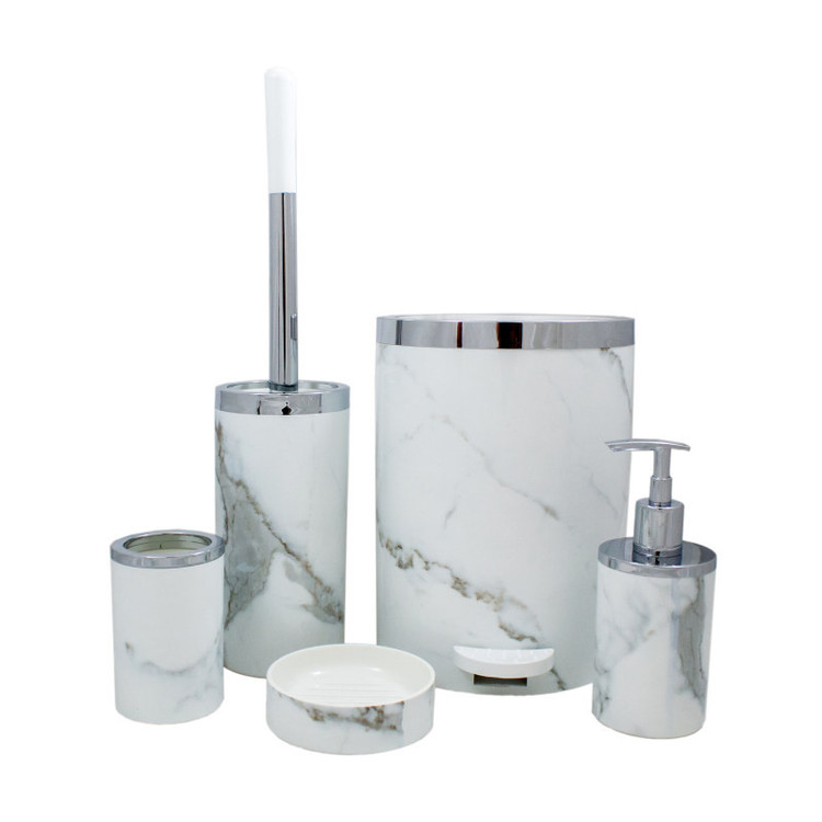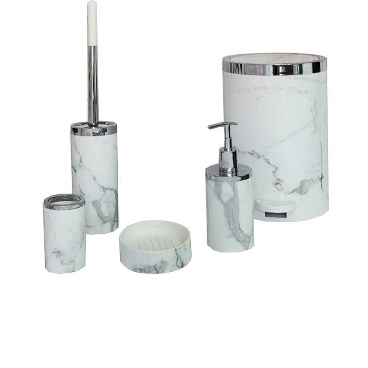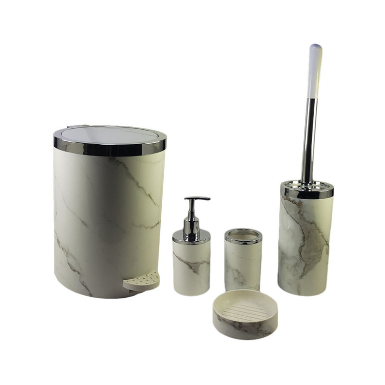 ست 5 تکه سرویس بهداشتی روشا ،کمجا شیک با رنگ ثابت دربرابر آب و رطوبت دارای بهترین متریال پلاستیک فشرده شامل بالاترین تنوع طرح و رنگ آمیزی خاص، برای مشکل پسندان .که شامل سطل زباله ،جای مایع دستشویی، برس توالت شوی، جای صابون جامد و لیوان میباشد .